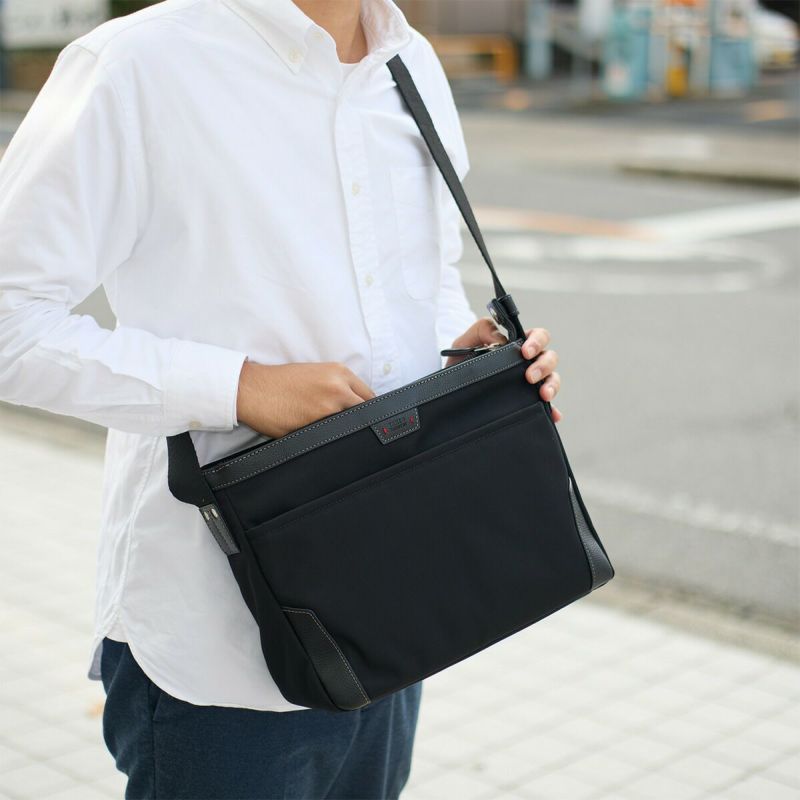 本体生地に、強撚・高密度・Teflon加工を施したナイロンを使用し、付属にはSCOTCHGARDの防水加工を施したシュリンクシボ(エンボス)牛革を使用します。 どちらも水に強い素材を使うことで天候に左右されにくい、ON・OFFどちらでもお使いいただけるショルダーバッグです。