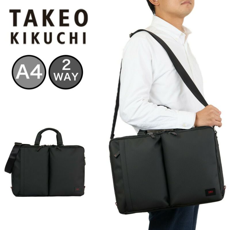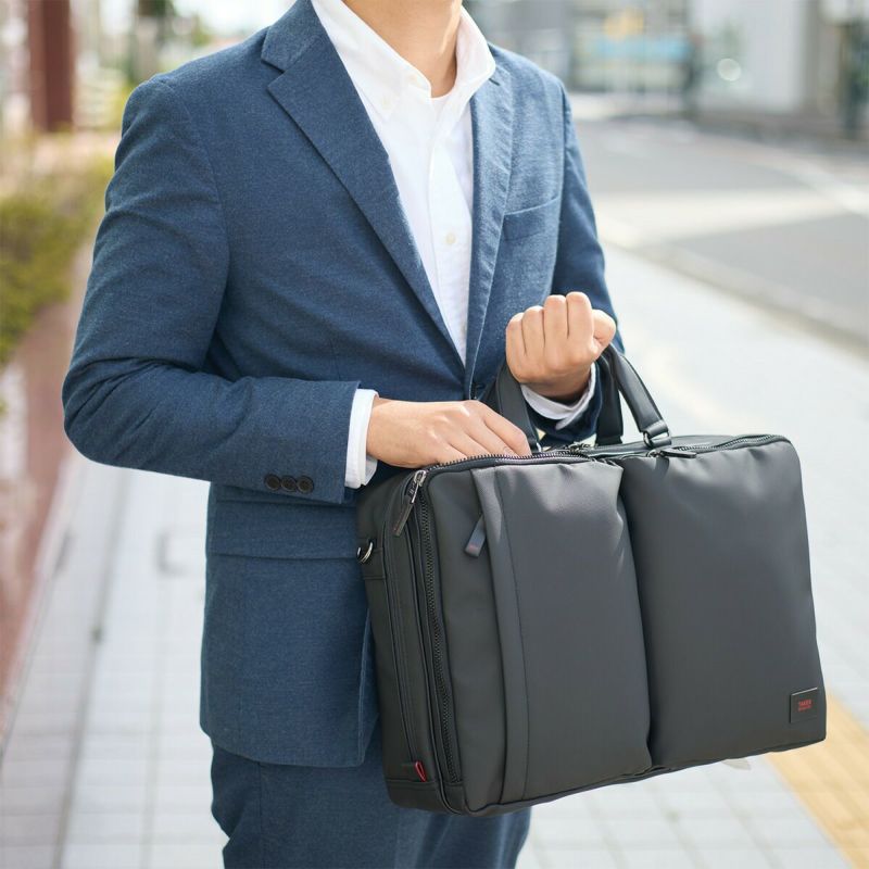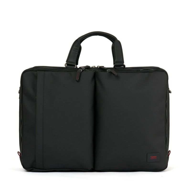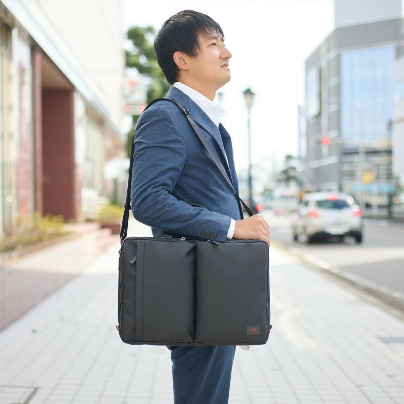 出張にも対応したタケオキクチのA4サイズビジネスバッグ。斜め掛けとしても使える肩紐付きの2WAYバッグです。