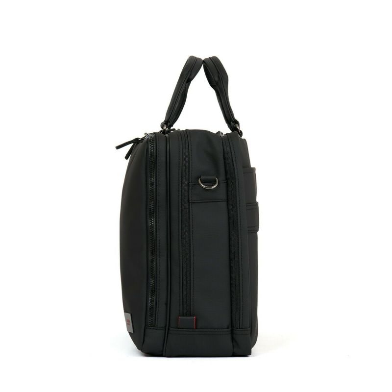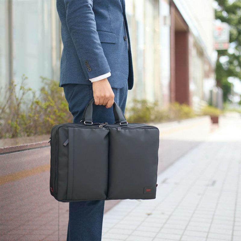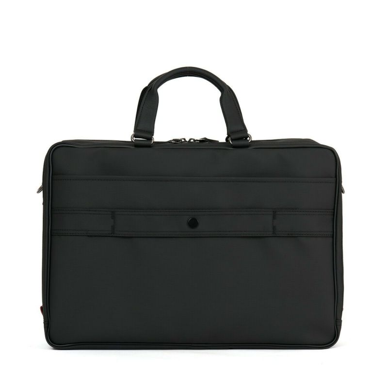 キャリーオン機能付きで、キャリーバーに固定するベルトが装備されています。泊りでの出張にも最適のビジネスバッグです。