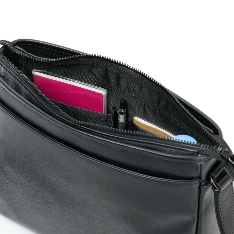 きれいめスタイルを完成させてくれる、ON/OF兼用で使えるTAKEO KIKUCHIのB5サイズのショルダーバッグです。B5サイズのノートや長財布がすっぽりと入るサイズ感になっているので、タウンからトラベル、仕事までと幅広いシーンでお使いいただけます。