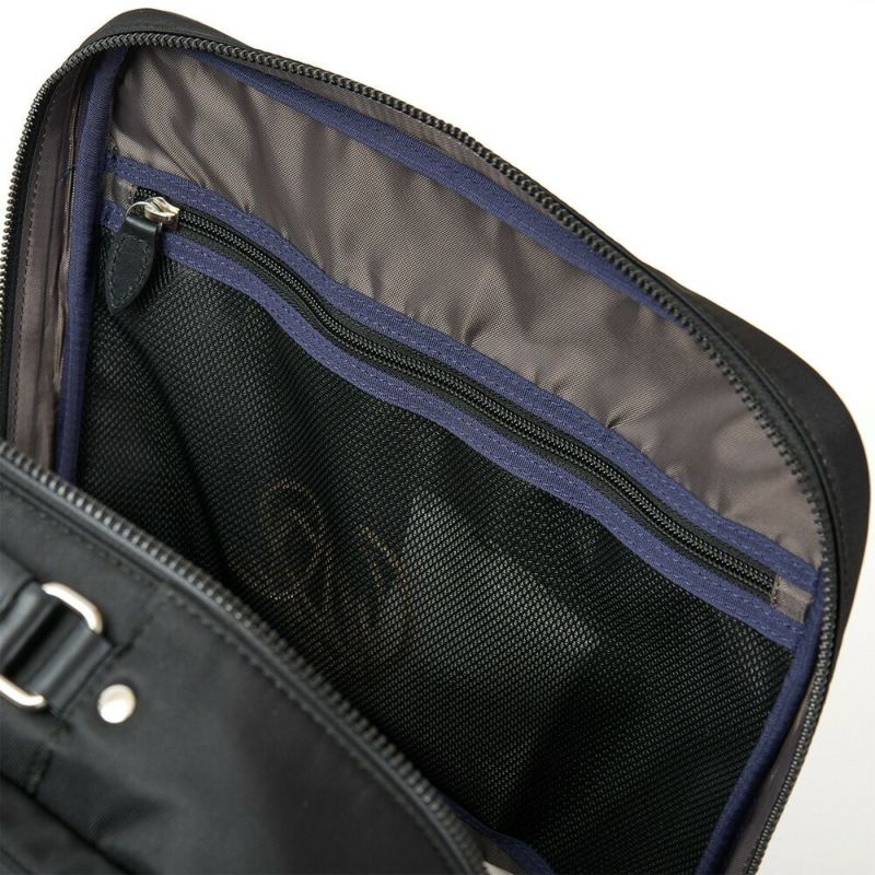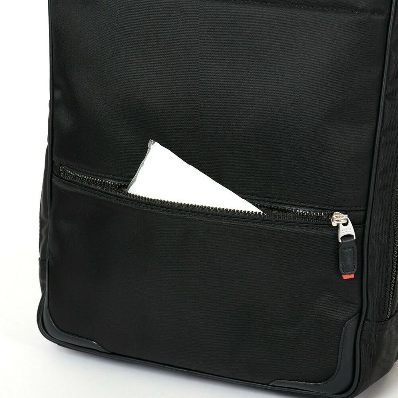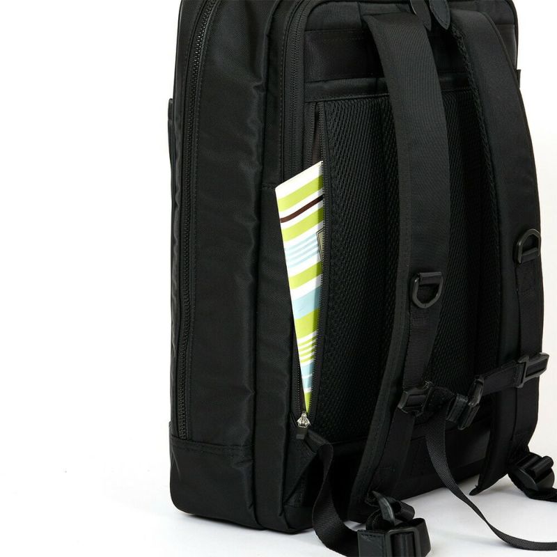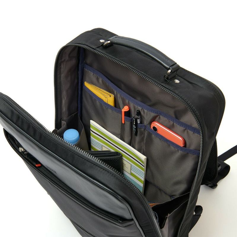 リュックの前面にはファスナーポケットを2つ装備。パスケースやスマホなど、さっと取り出したい荷物の収納におすすめです。背面側のファスナーをあけると、内側がクッション材となっているノートパソコン収納ルームがあります。15.6インチまでのPC収納に対応しています。さらに背中が当たる部分には左右どちらからもアクセスが可能なファスナーポケットがあり、財布など貴重品の収納に便利です。