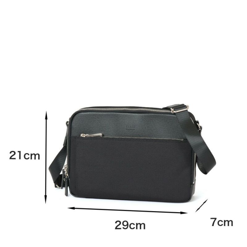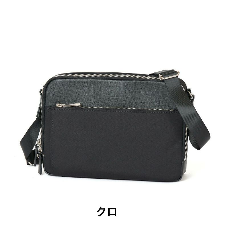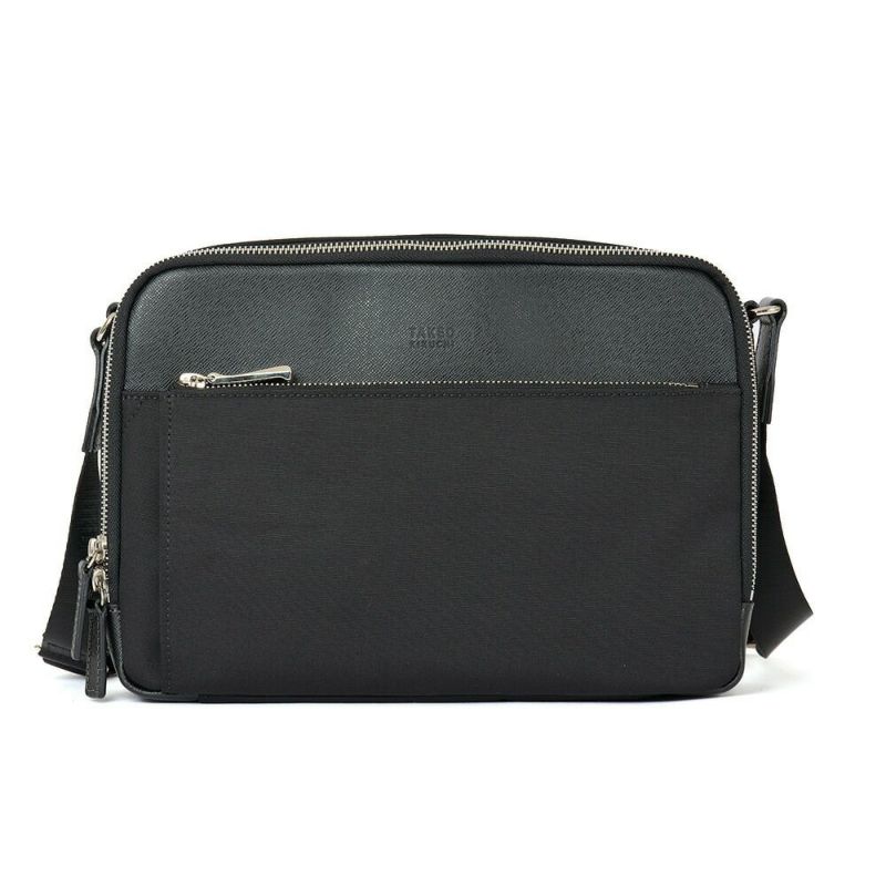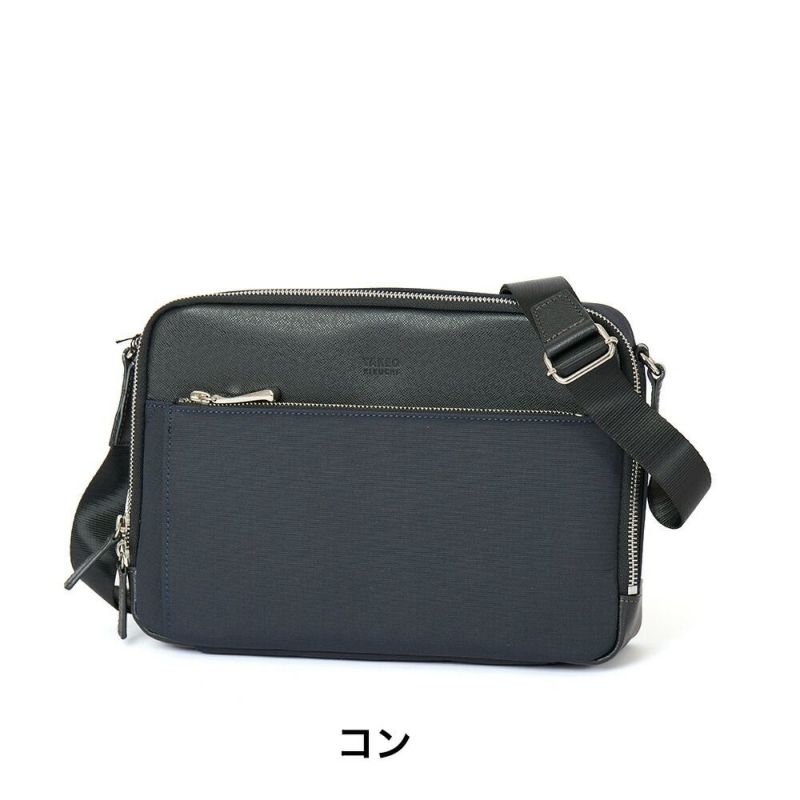 急な雨が降っても安心な、撥水性や防汚性に優れた素材を使用した、TAKEO KIKUCHIのショルダーバッグ。アクセントのレザーが上品で高級感のある外装と、アーガイル柄のネクタイ生地を使用した内装は、大人カジュアルなデザインです。