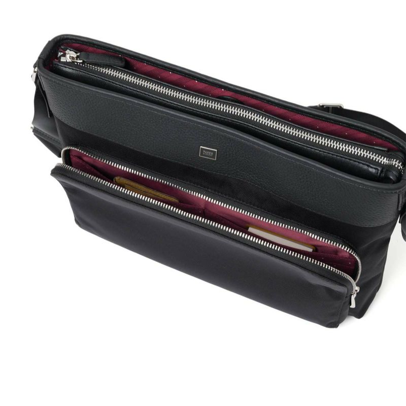 タケオキクチを象徴するネクタイ柄「ドットストライプ」をポイントにしたセミハードなカジュアルシリーズ。本体生地は折り目の凹凸感、畝感がハッキリしている強撚糸ナイロン、付属は物性的に優れたシュリンク牛革を使用しています。