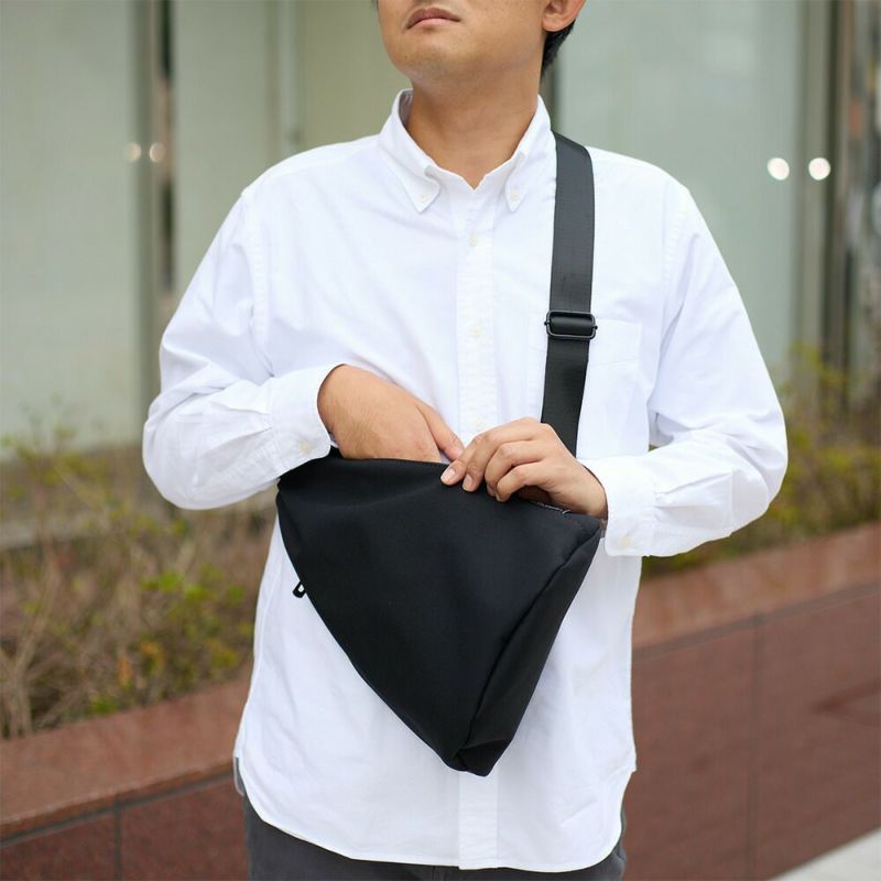 トライアングル調のシルエット・フロント上部のタックデザインが特徴です。左右に配置したファスナーは両方ともメイン層にアクセスできる仕様です。