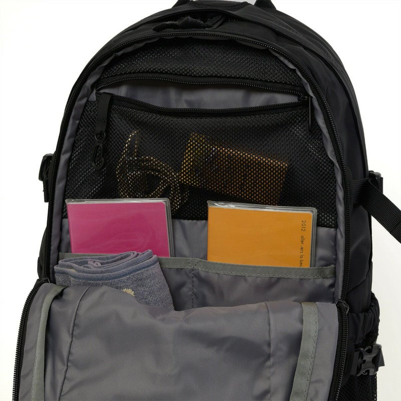 メインコンパートメントは、大きく開閉するパネルローディングタイプ。15インチまでのノート型PC専用スリーブとハイドレーション用のスリーブポケット付き。メイン生地と補強生地の両方にリサイクル素材を採用し、環境保護へも配慮しています。