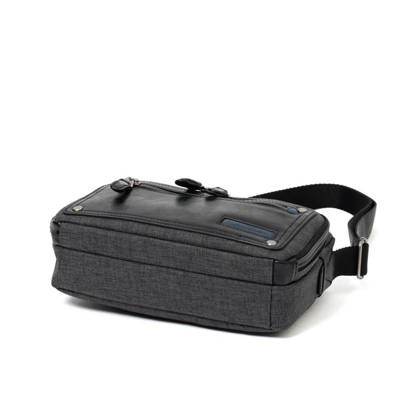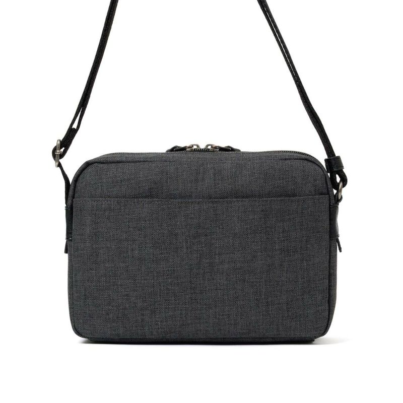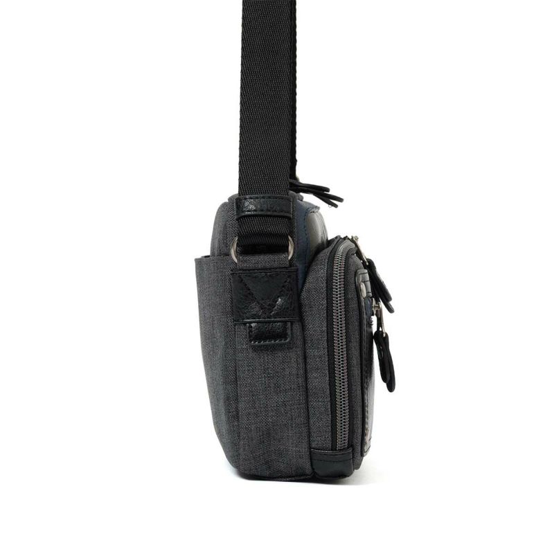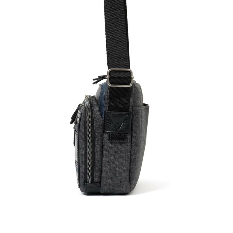 合皮とポリエステル生地を組み合わせたおしゃれなショルダーバッグ。コンパクトなデザインながらポケットも充実しており、財布・スマホなど、必要アイテムをしっかり収納でき、ちょっとした外出、旅行時のサブバッグにも最適なアイテムです。