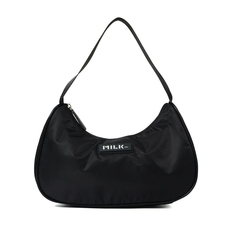 ■ツヤっとした生地感とロゴプレートをポイントにした、大人でも持ちやすいハンドバッグ