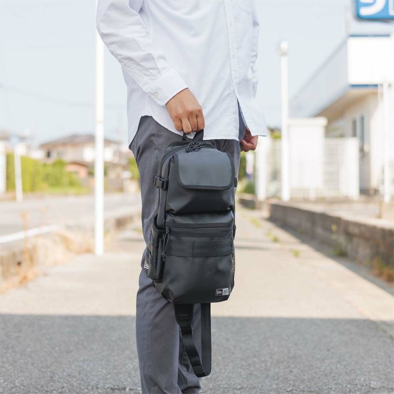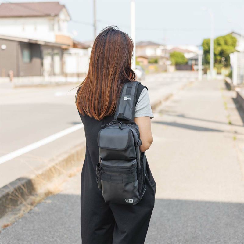 メッセンジャーバッグのように斜め掛けで使用することを前提としたボディバッグです。縦長のシルエットが特徴で、利便性を考慮したニューエラならではの機能が随所に配備されています。