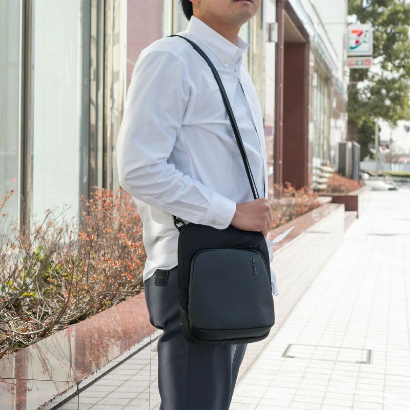 コンパクトな縦型ショルダータイプで、長財布、ペットボトル、タブレットなども収納可能なメインコンパートメントを有し、必要最小限の荷物だけを持って気軽に街歩きしたいユーザーに最適。サブコンパートメントも含めて細部のひとつひとつにブランドの想いが宿っています。