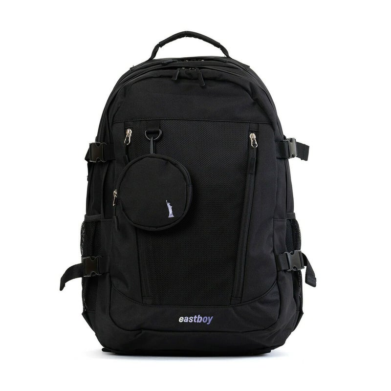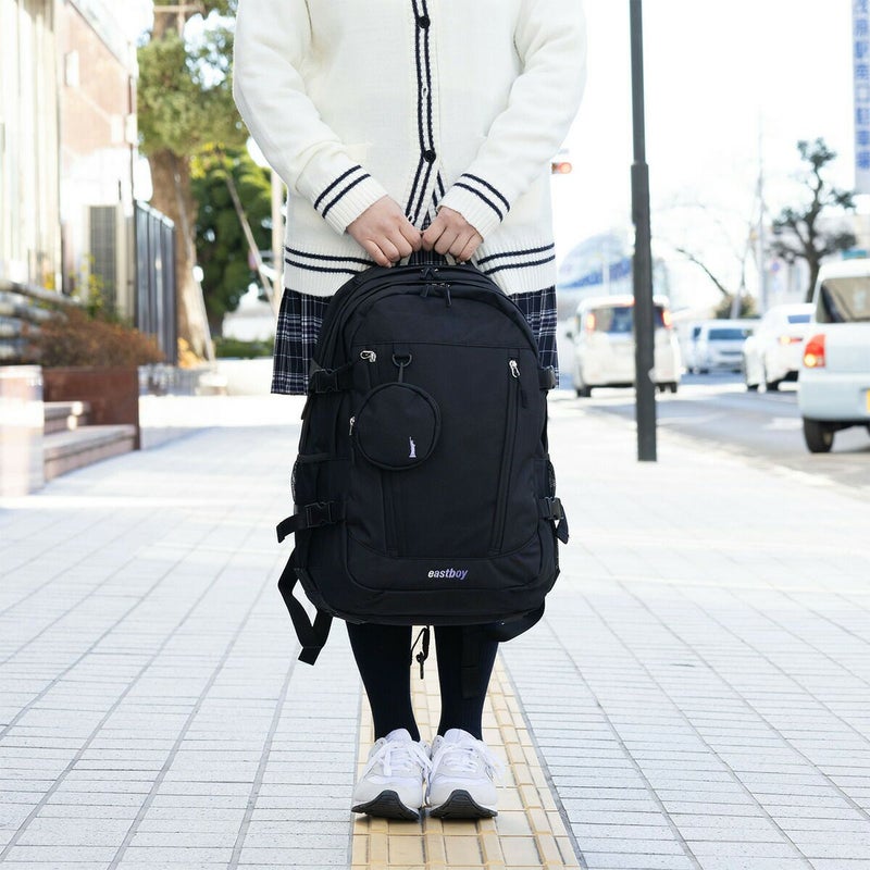 イーストボーイのポーチ付きメッシュリュックです。ショルダー部分が少し細いので、体によりフィットします。取り外せるファスナー付ポーチには女神刺繍が入っており、バッグ下側にもEASTBOYのグラデーション刺繍入り。取り外し可能なチェストベルト付きなので、胸部分で固定ができてショルダーのズレを防ぎ安定します。