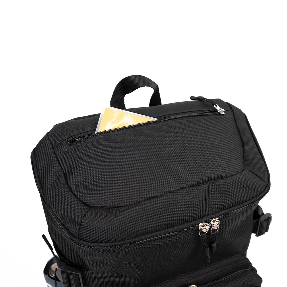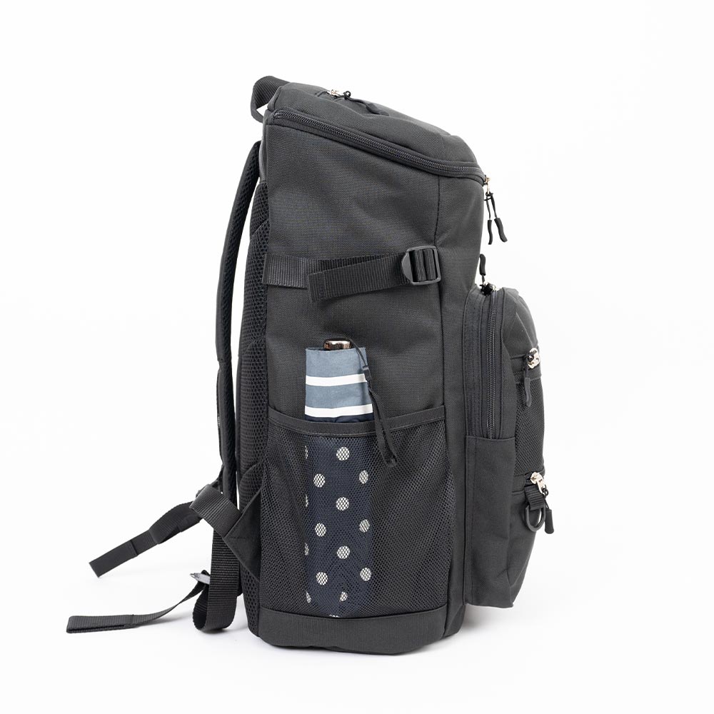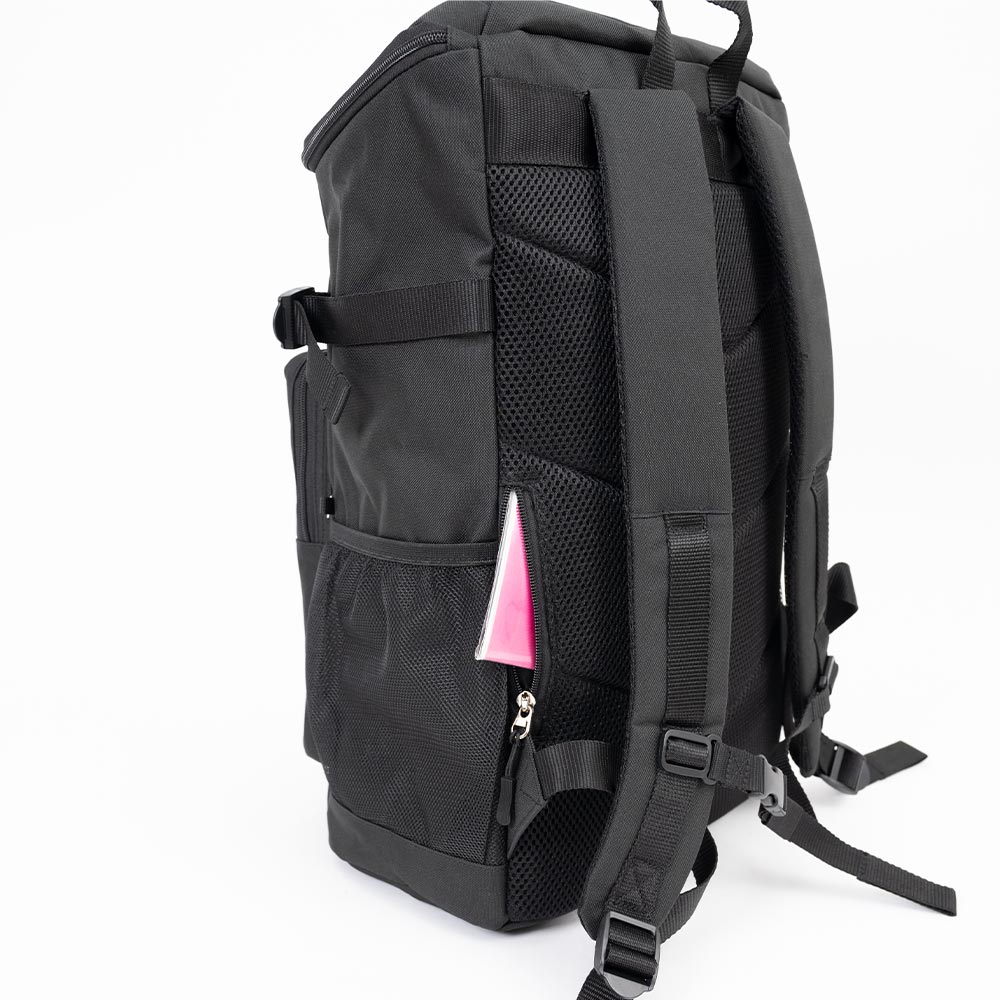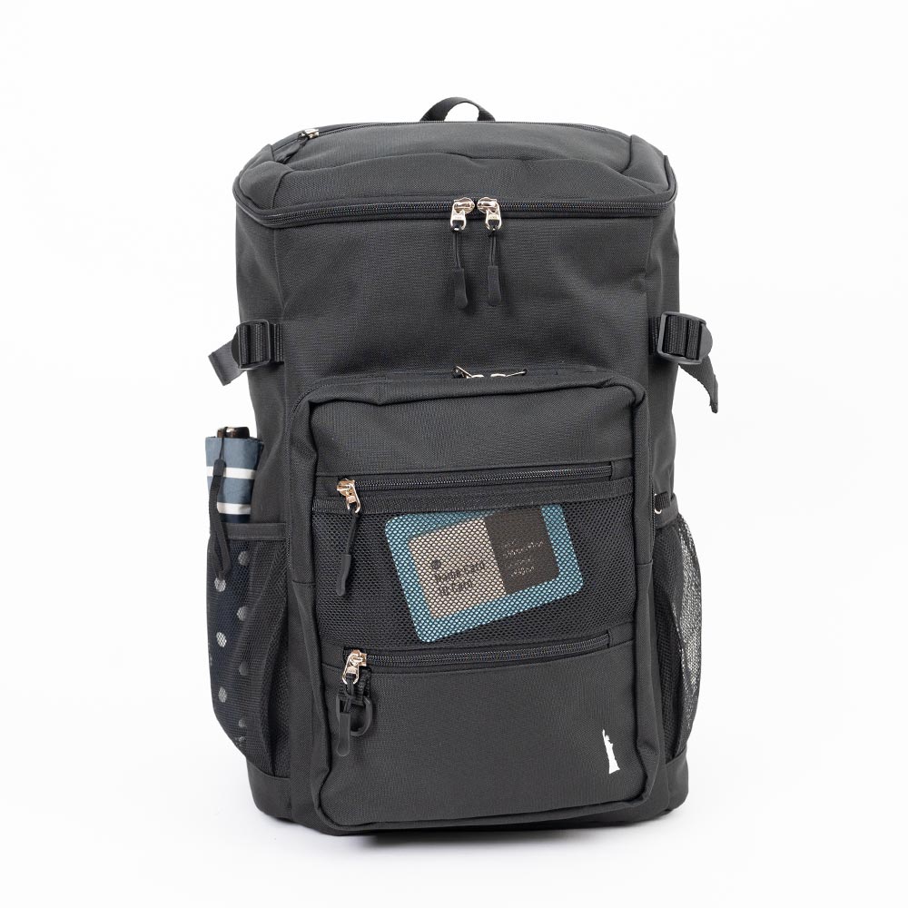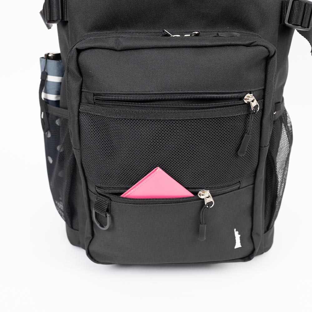 リュックを背負った時にすっきり見えるデザインです。上部分にもファスナーポケットが付いているので、前に背負った時でも小物などが取り出しやすいです。 Dカンやメッシュポケットもあるのでキーホルダーなどを付けたり入れたりすることができます。 ショルダーストラップとチェストベルトを止めることにより背中への密着が感じられ、安定感が感じられます。 撥水生地使用。(防水ではありません。)