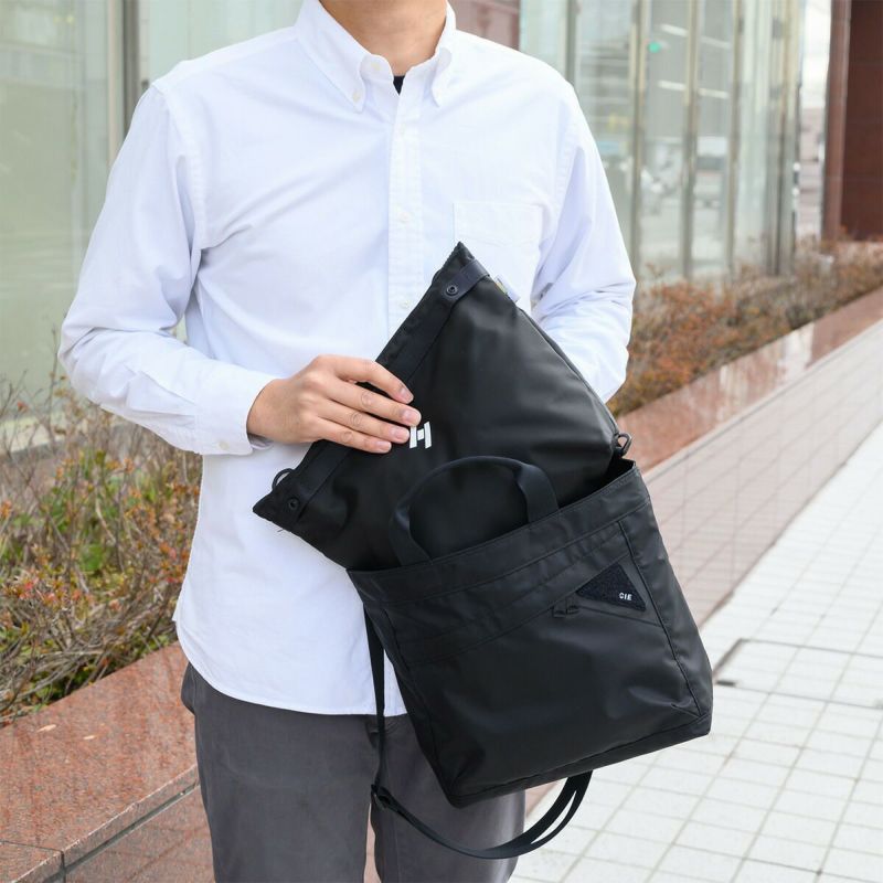 master-piece(マスターピース)やAS2OV(アッソブ)を経たデザイナーが手がける、新しい価値観を提案するブランド「CIE」。 本体に内装されているインナーバッグは、スナップボタンで取り外しが可能になっており、取り出しミニトートバッグとショルダーバッグ2つのバッグとして使用可能です。 用途や気分に合わせて使い分けができ、旅行や出先で荷物が増えた際にも便利な2WAY仕様になっています。 本体生地には、CIEオリジナルファブリックを使用。210dオックスナイロンを表面に4層で構造された高機能素材になります、表面に弱撥水加工、防水性を備えております。