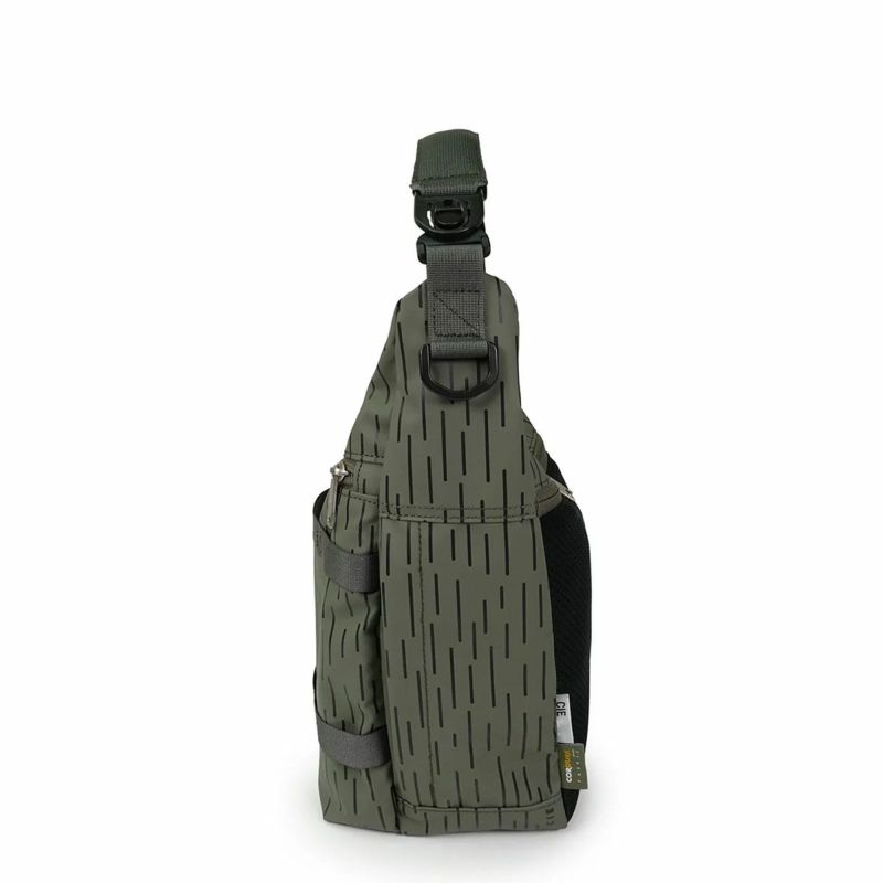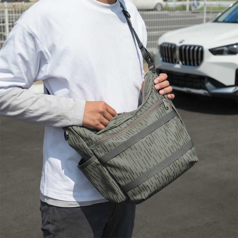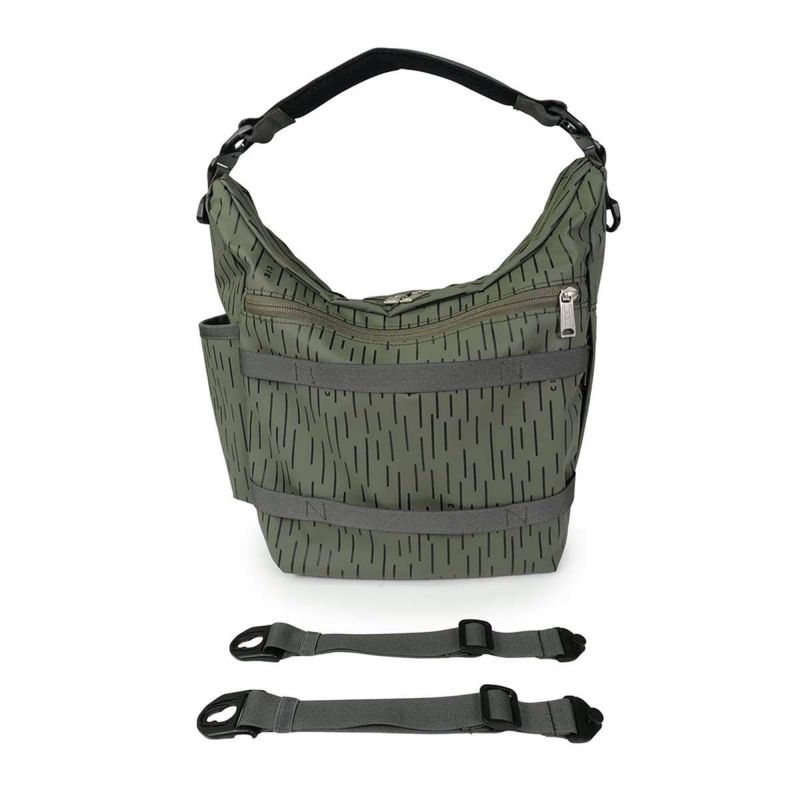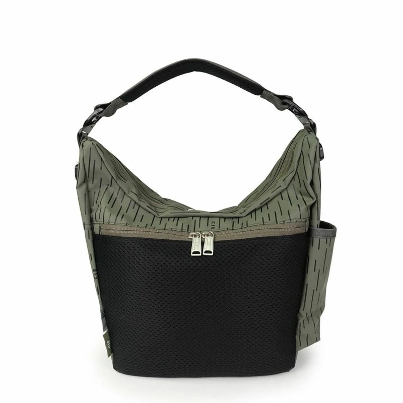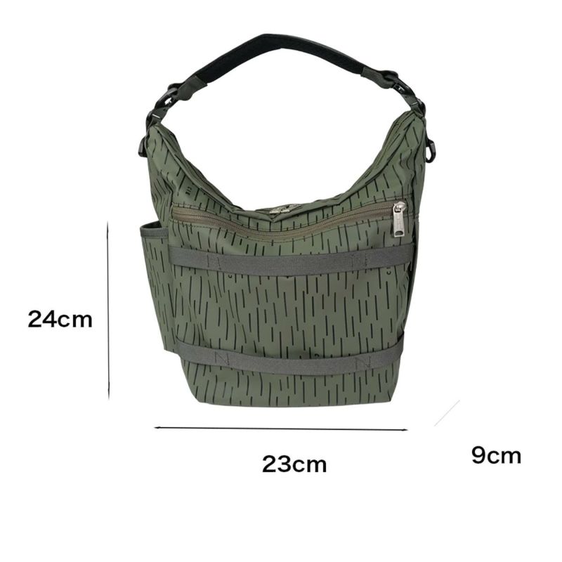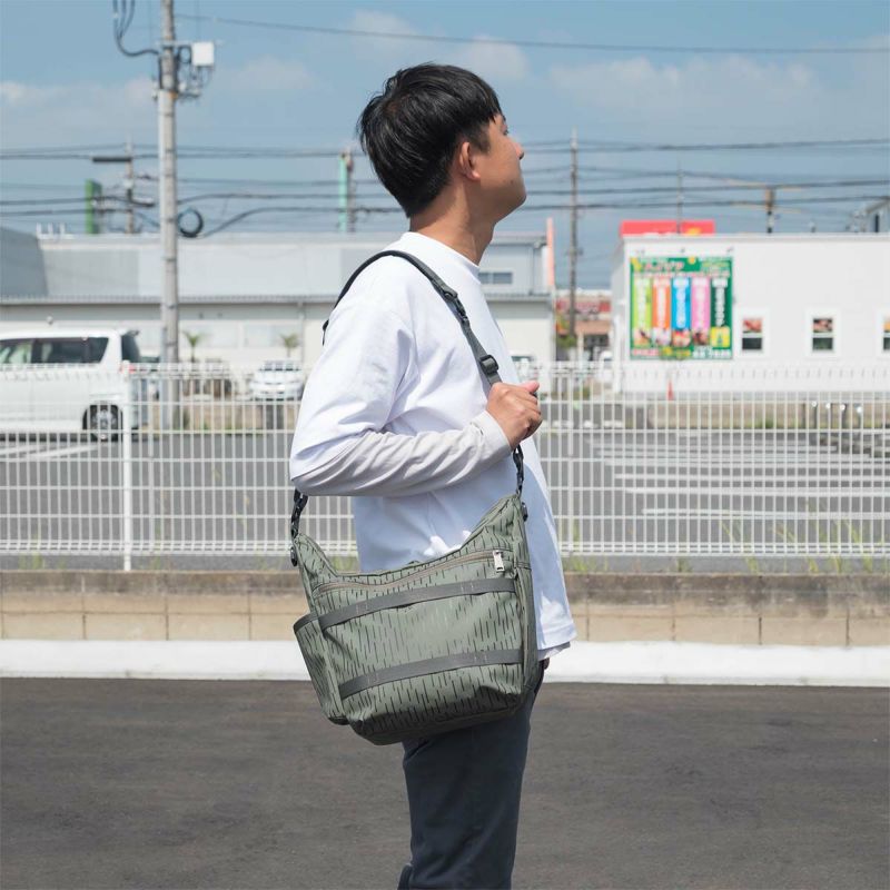 本体はショルダーハーネスを付け替える事によりショルダーバッグとワンショルダーの2WAY仕様となっております。サイド左側にはICカードやモバイルを収納可能なZIPポケット、右側にはボトル収納ポケットを配しております。テープディティールは高密度で織られた畝が特徴的なミリタリーライクなトジ織のナイロンテープを使用しており、カラビナや小物などを引っ掛ける事を想定したテープ使いとなっております。