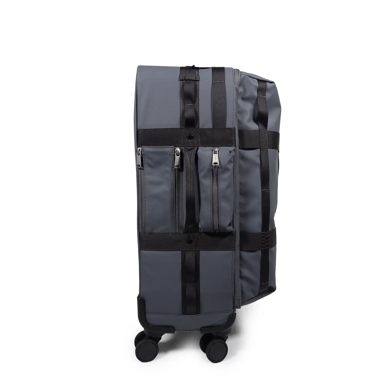 GRID3の特徴である格子状のナイロンテープを全体に配し、様々なアイテムをアタッチメント可能な4ウィールのトロリーバッグとなります。本体トップには耐久性のある樹脂ハンドル、サイドにはポケット自体収納可能なボトルポケットや、ショッピングバッグなどをかける樹脂フックを備えております。