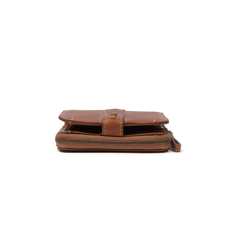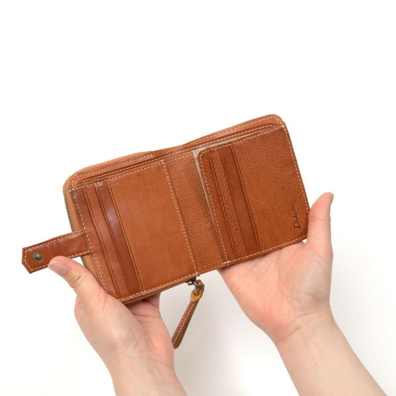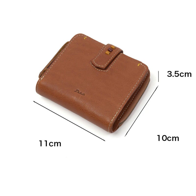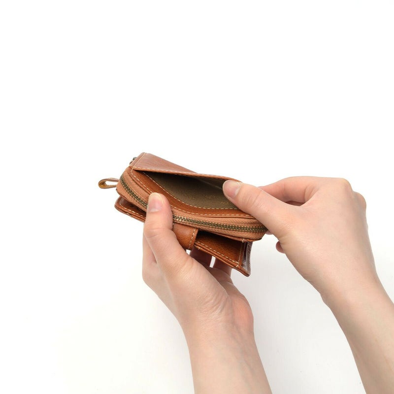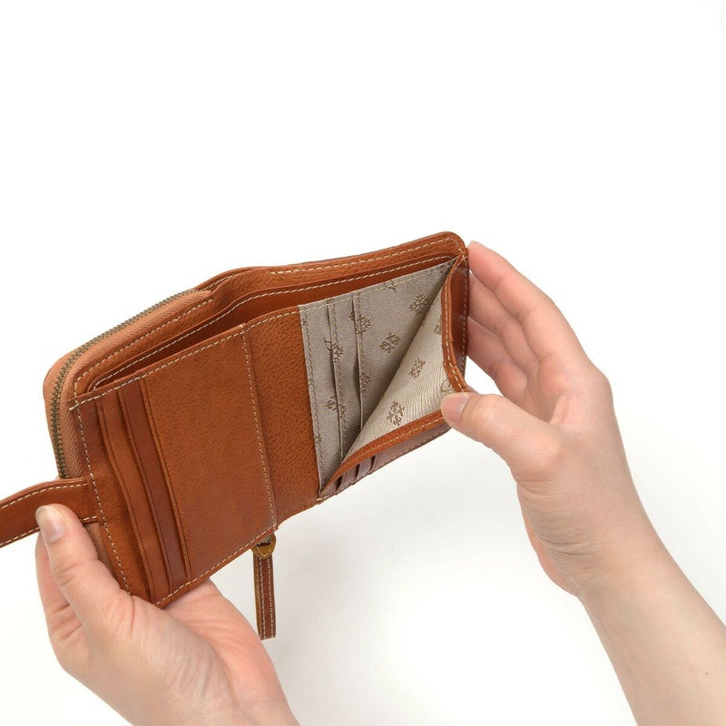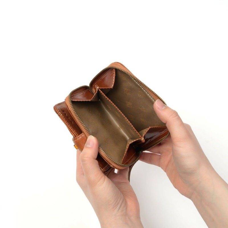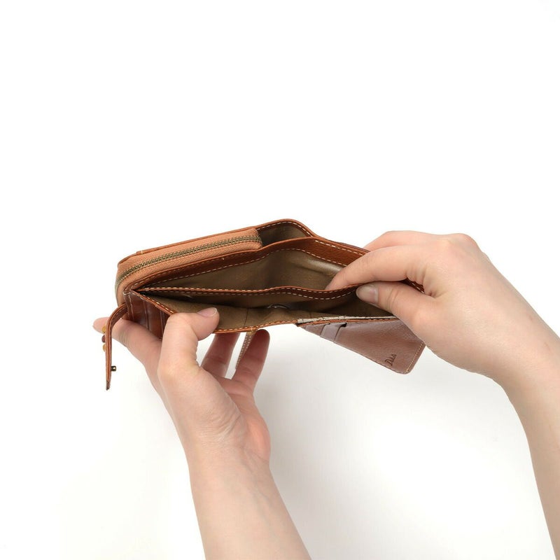 素材の風合いを楽しみながら永くお使いいただけるよう、イタリアンレザーを使用しました。デザインアクセントになっている小さなビーズも革で仕立てているので、本体の風合いと同じように使い込むほどに味わい深くなってゆきます。 スクエアフォルムの二つ折り財布です。ワンアクションで小銭入れにダイレクトにアクセスできるので、小銭の出し入れがスムーズに行えます。カードは8枚収納でき、コンパクトな見た目ながらも収納しやすいデザインです。
