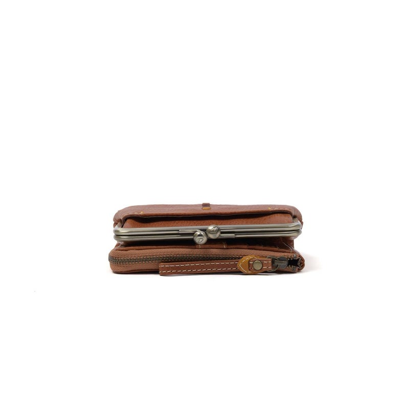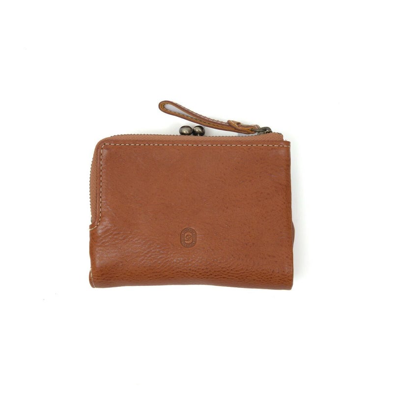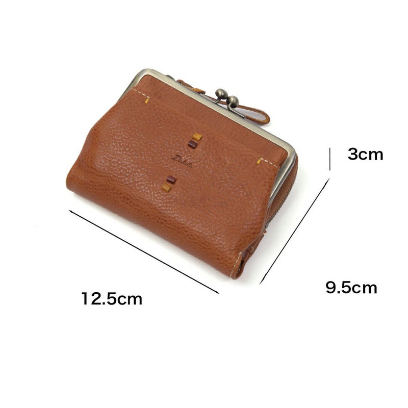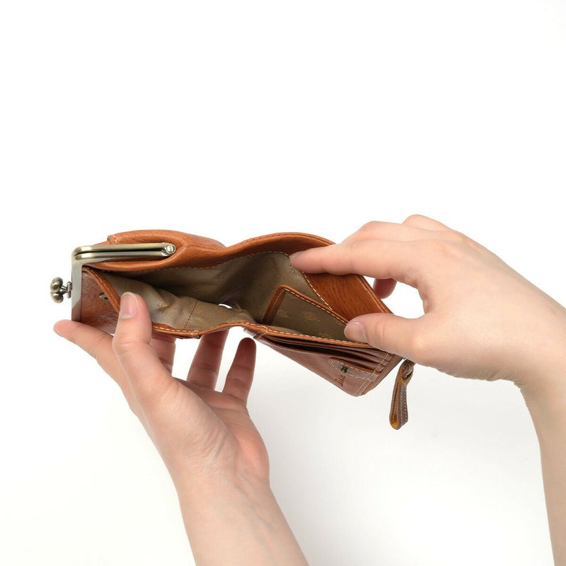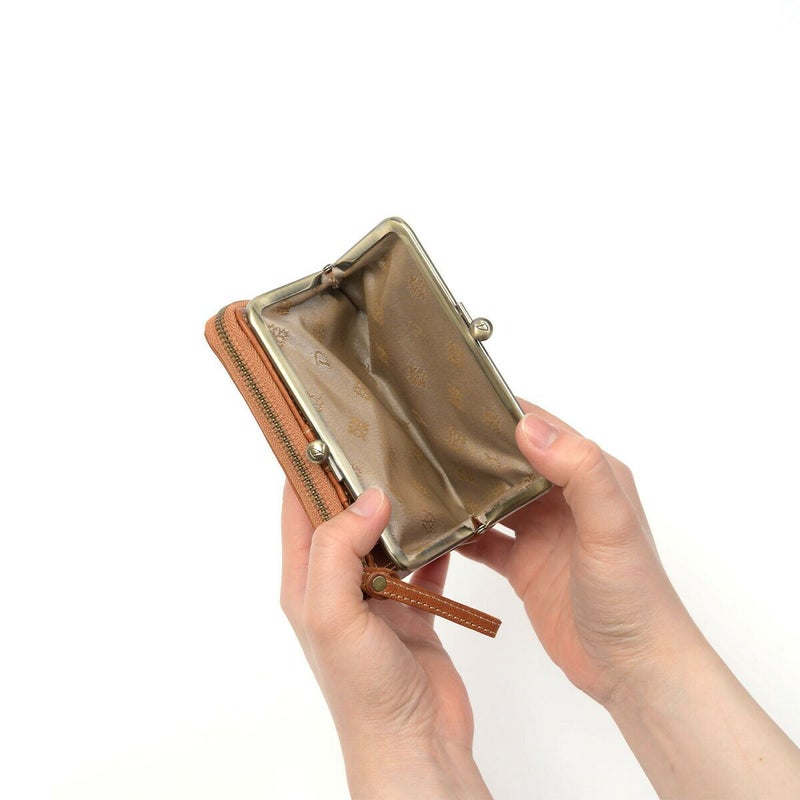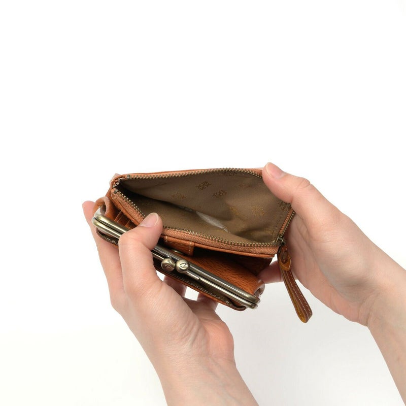 素材の風合いを楽しみながら永くお使いいただけるよう、イタリアンレザーを使用しました。デザインアクセントになっている小さなビーズも革で仕立てているので、本体の風合いと同じように使い込むほどに味わい深くなってゆきます。 レトロで可愛らしい雰囲気のがま口二つ折り財布です。小銭入れはがま口で大きく開くので、小銭の出し入れがしやすいです。カードポケットは5か所と少なめですが、L字ファスナー開閉のフリーポケットにカード類をまとめて収納が出来るため、小銭やカードが多くなりがちな方にオススメの二つ折り財布です。