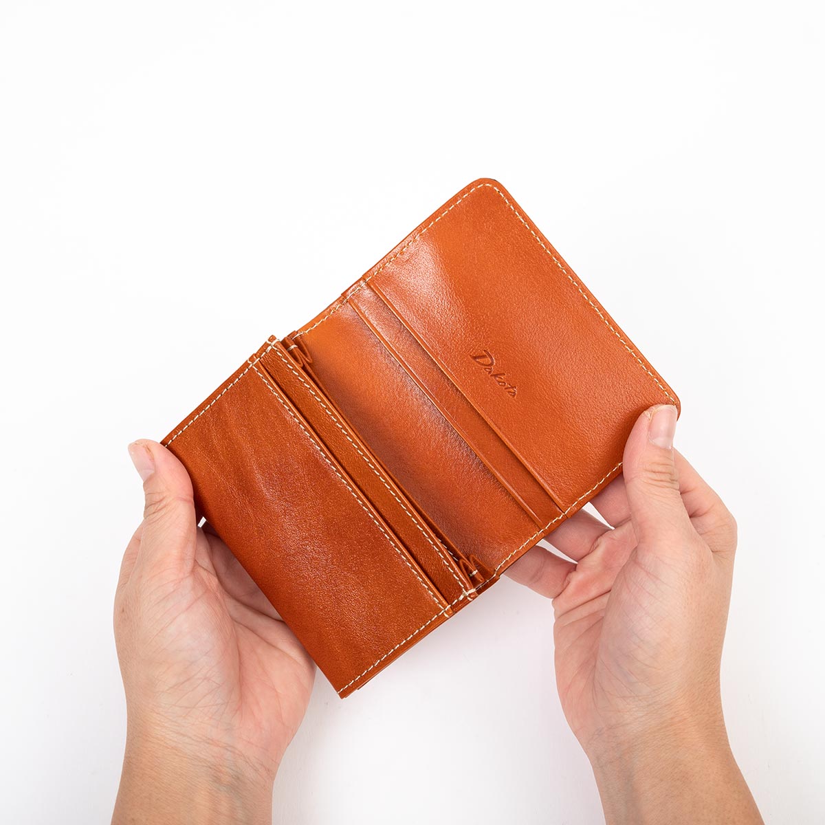 ビジネスシーンで使いやすい、シンプルなデザインの名刺入れ。開くとカードポケットが2つ、フリーポケットが1つ付いています。中は2つに仕切られており、名刺の整理がしやすい仕様に。