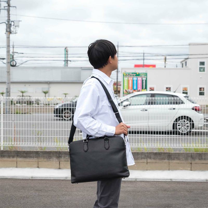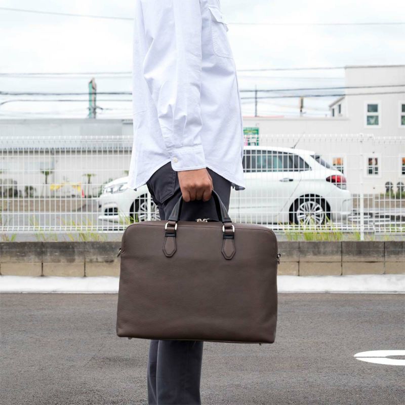 素材感を活かしたシンプルな外観のブリーフケースは、A4ファイルや13インチノートPCの収納に適したスタンダードなサイズと必要十分な収納力を備えています。