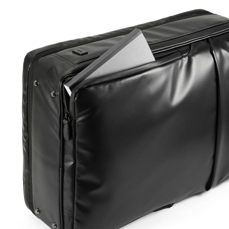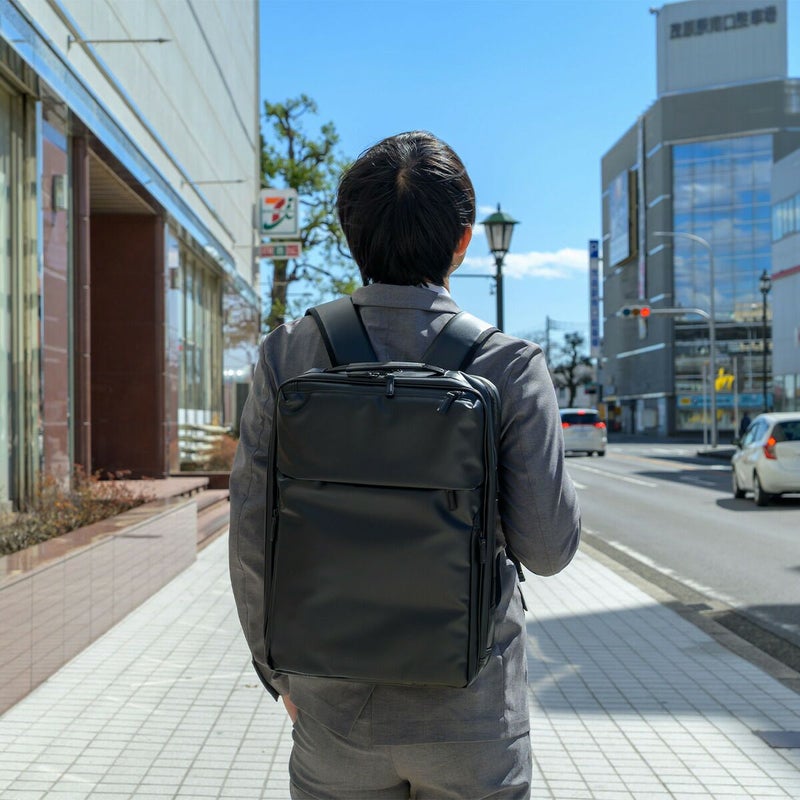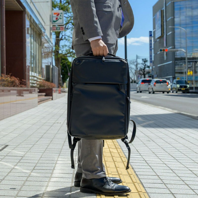 エキスパンド機能で出張にも対応した、通勤やタウンユースなどオンオフ兼用できるB4ファイル対応の薄マチリュック。15.6インチPC収納可能。