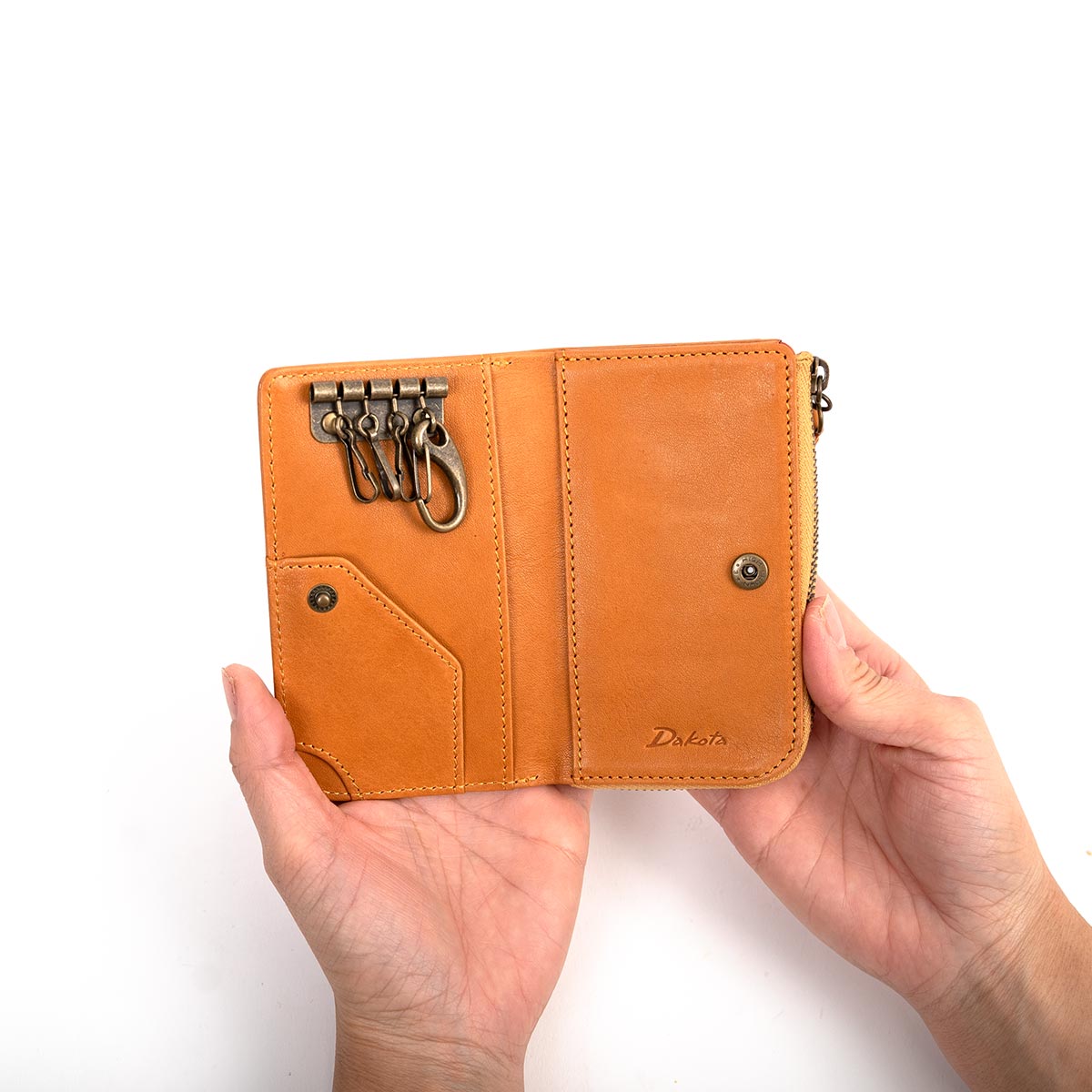 ファスナー収納付きのキーケースです。ホック式の金具に加え、ファスナー収納にはスマートキーを入れて持ち運ぶことも可能。さらにカードポケット付きで、小銭やお札を入れればミニ財布としても使える便利なデザインです。ギフトにもおすすめのアイテムです。