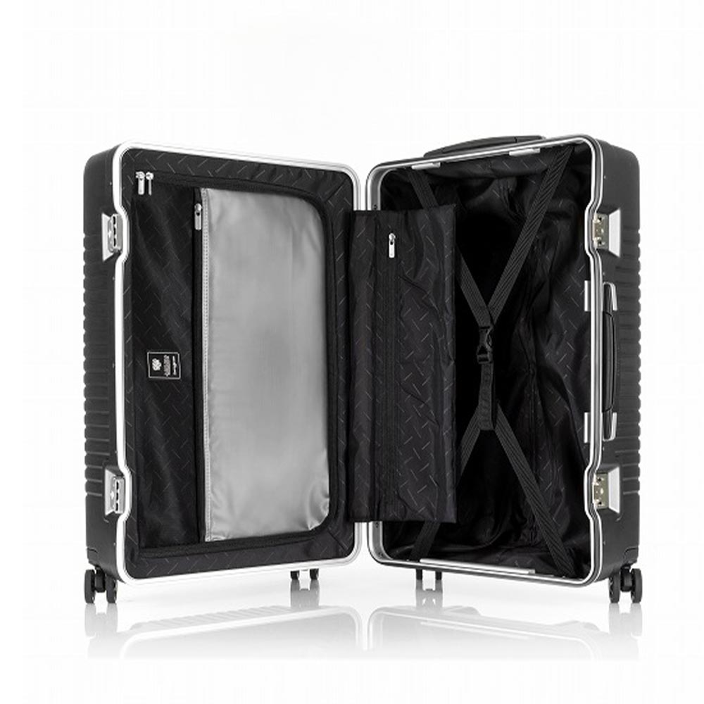 ・光沢のあるアルミフレームのスーツケースで、縦と横の溝が交差したデザインが特徴です。