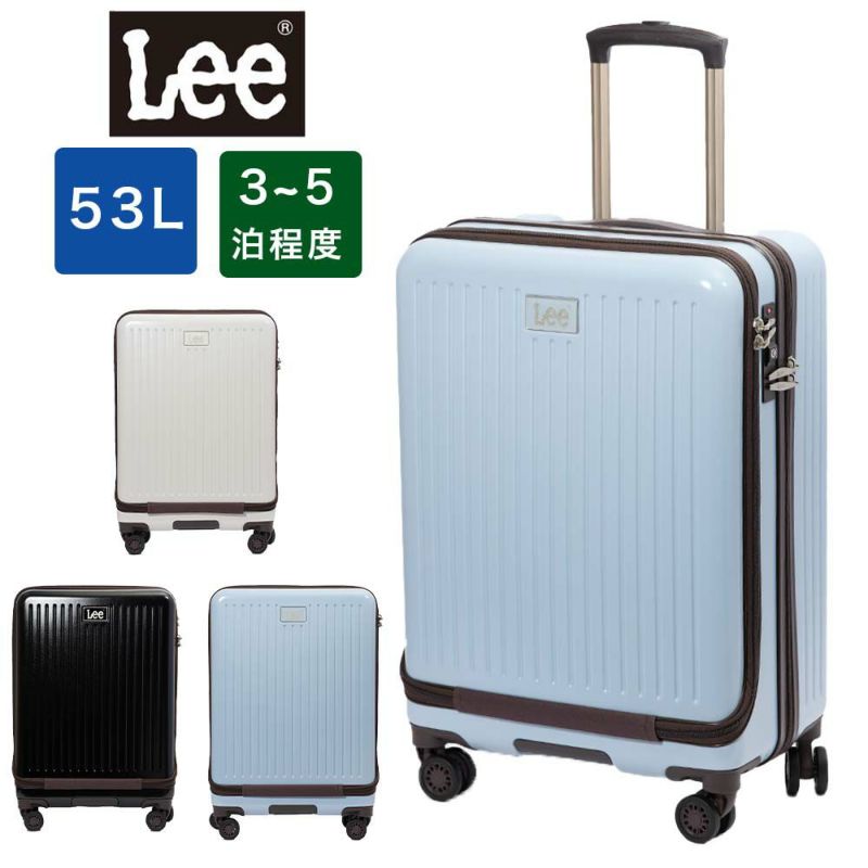 Leeのカジュアルなスーツケース。無駄を省いたシンプルなデザインの中にもタウンで目を惹くLeeのブランドロゴプレートが魅力。男女問わずお使いいただけます。 使い勝手の良いフロントオープンで、3層構造により更に区分けしやすい仕様になっています。内装生地もオシャレなバンダナ柄です。 3~5泊程度の旅行に適したサイズ。国内旅行はもちろん、短期の海外旅行にもおすすめです。