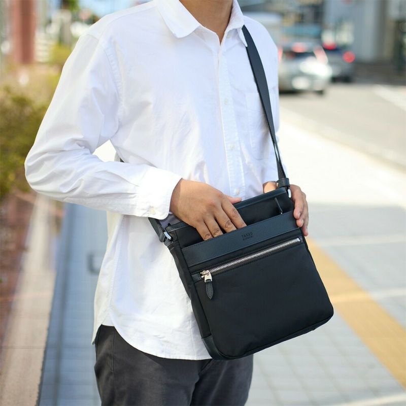 上品な光沢感と発色の良さが特徴のナイロンツイルを使用した、カジュアルショルダーバッグ。シンプルで使いやすいデザインの中に、付属革やメタルパーツでタケオキクチらしいこだわりを表現しています。