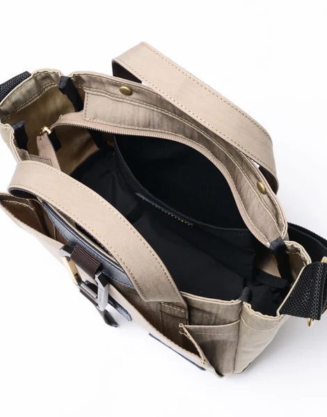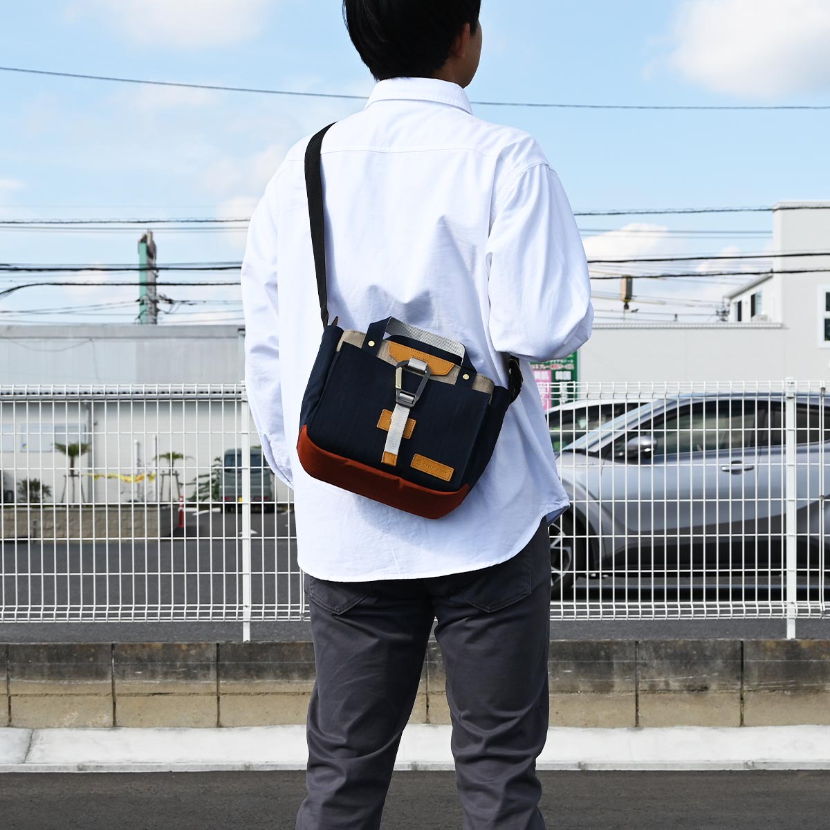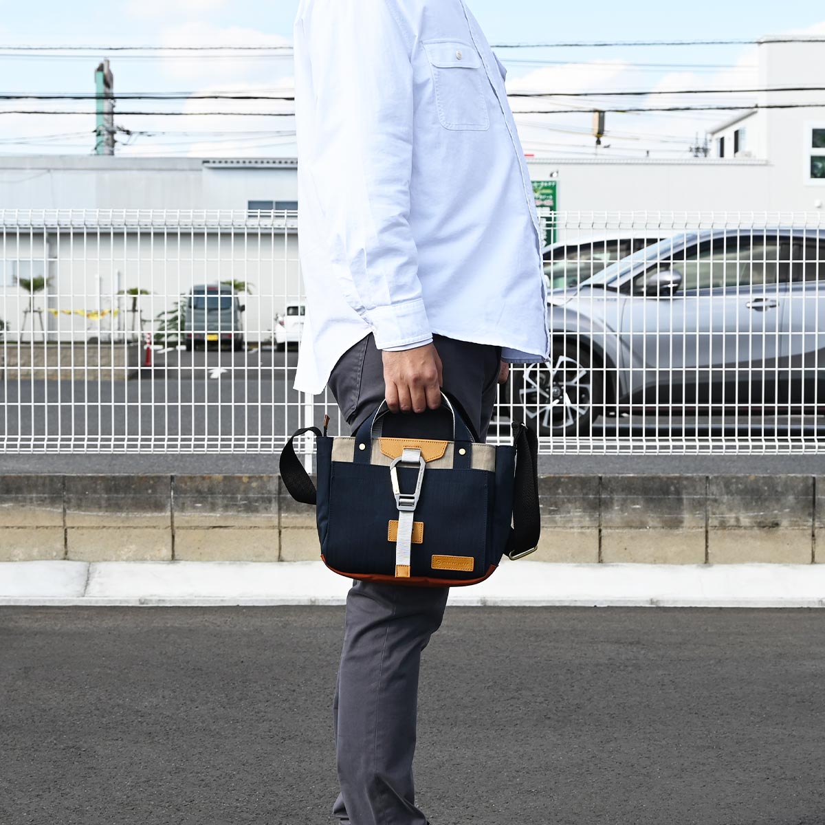 ショルダーストラップは固定仕様で、肩掛けにも手持ちにもスマートに対応します。程よいサイズ感ながら収納力もあり、デイリーのお出かけや休日の街歩きにも適したユニセックスで使用できるデザイン。