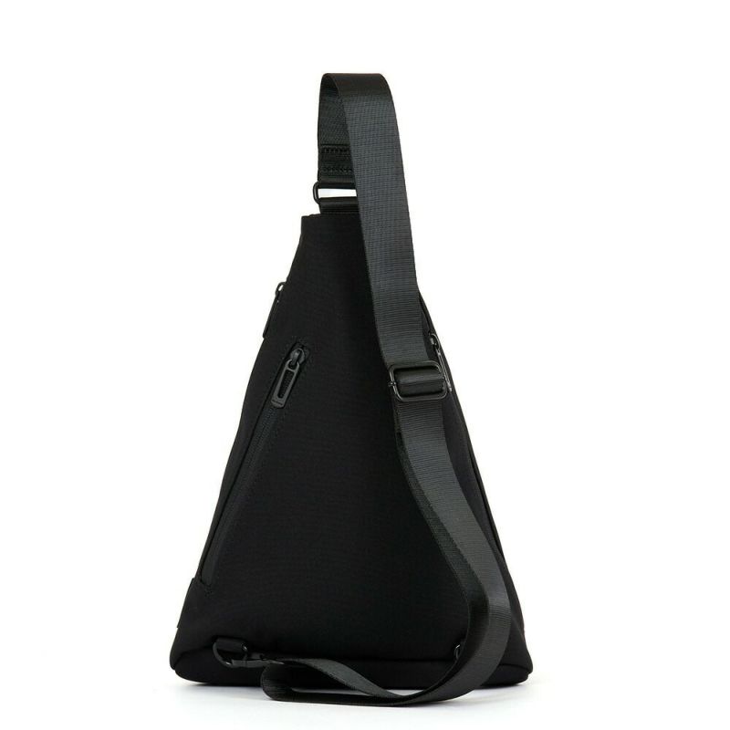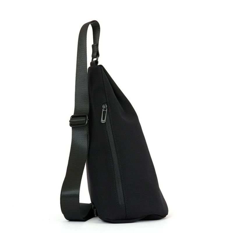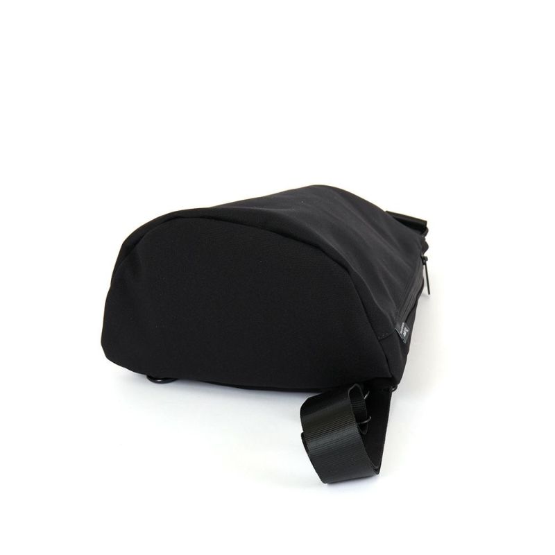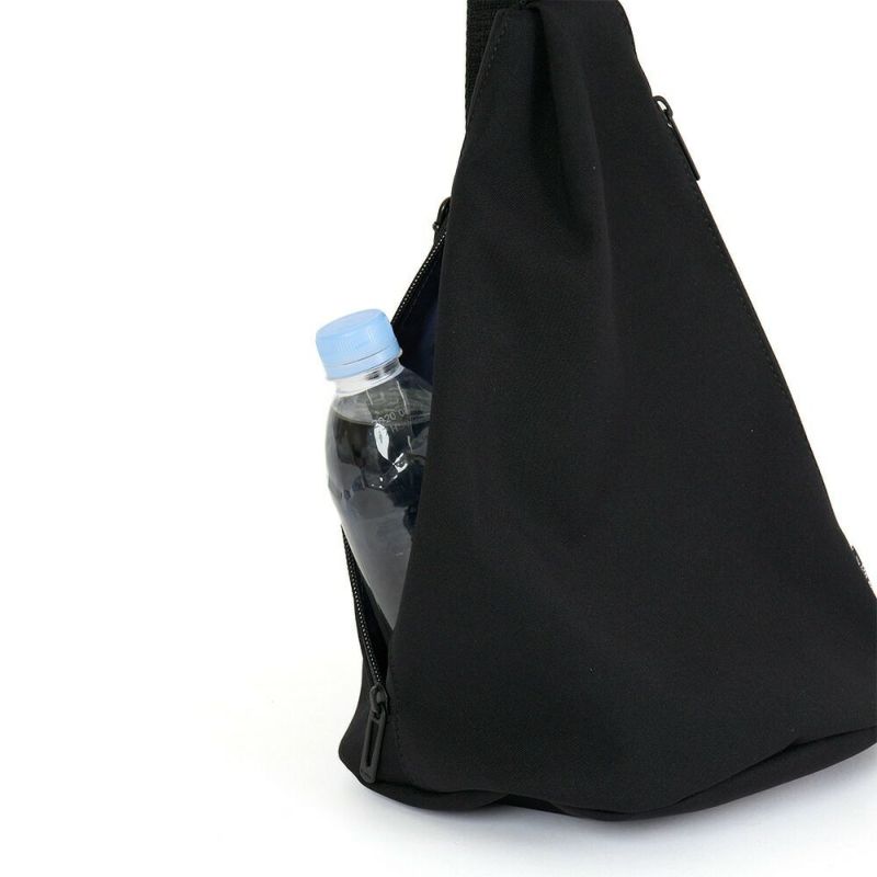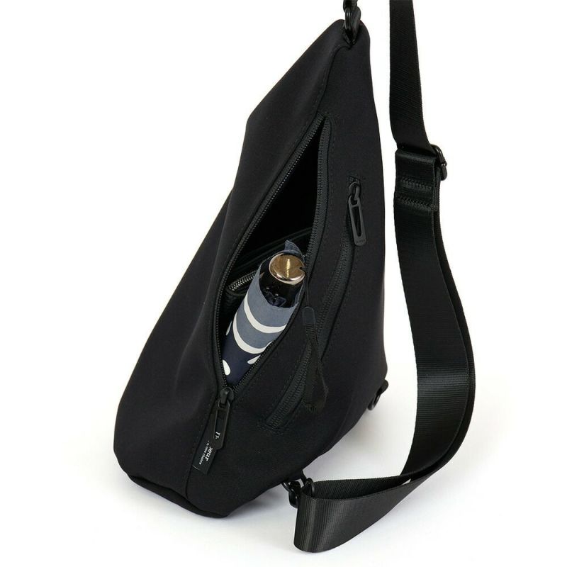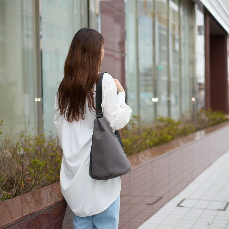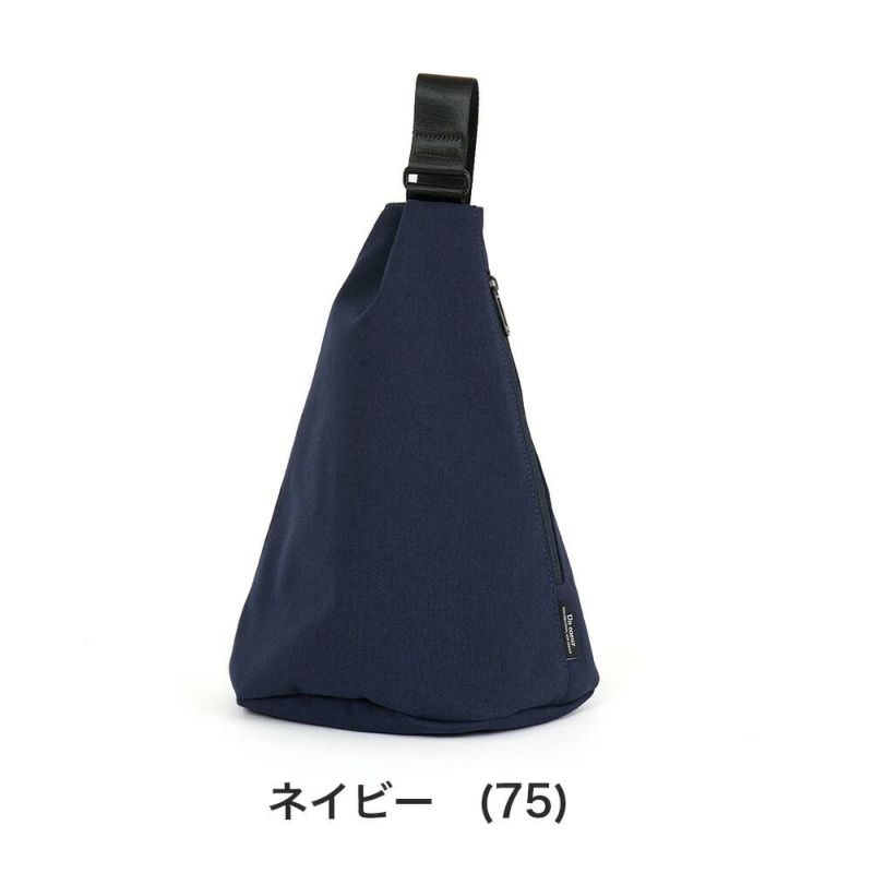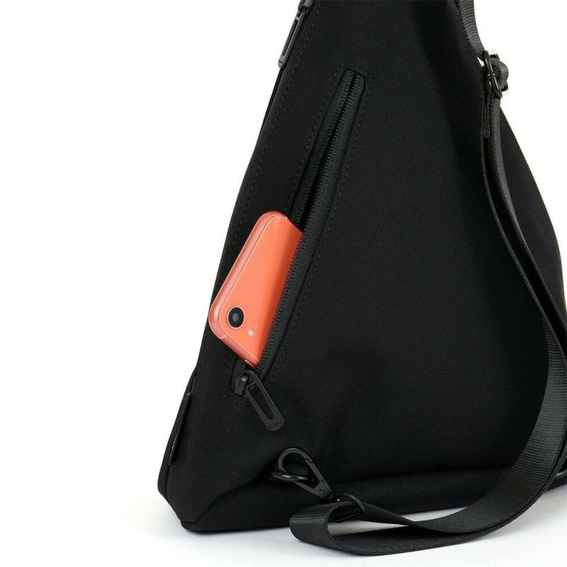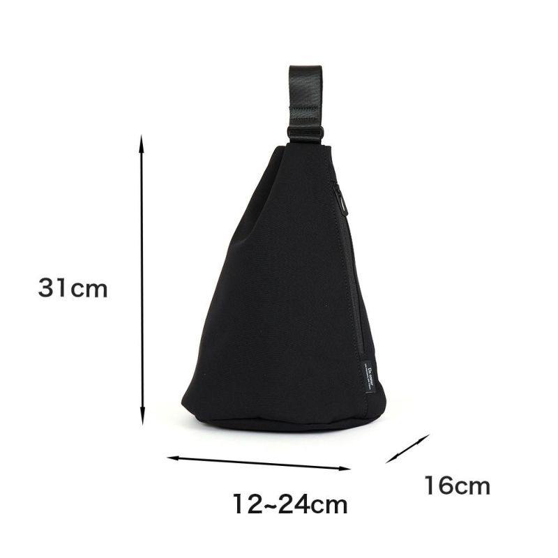 トライアングル調のシルエット・フロント上部のタックデザインが特徴です。左右に配置したファスナーは両方ともメイン層にアクセスできる仕様です。