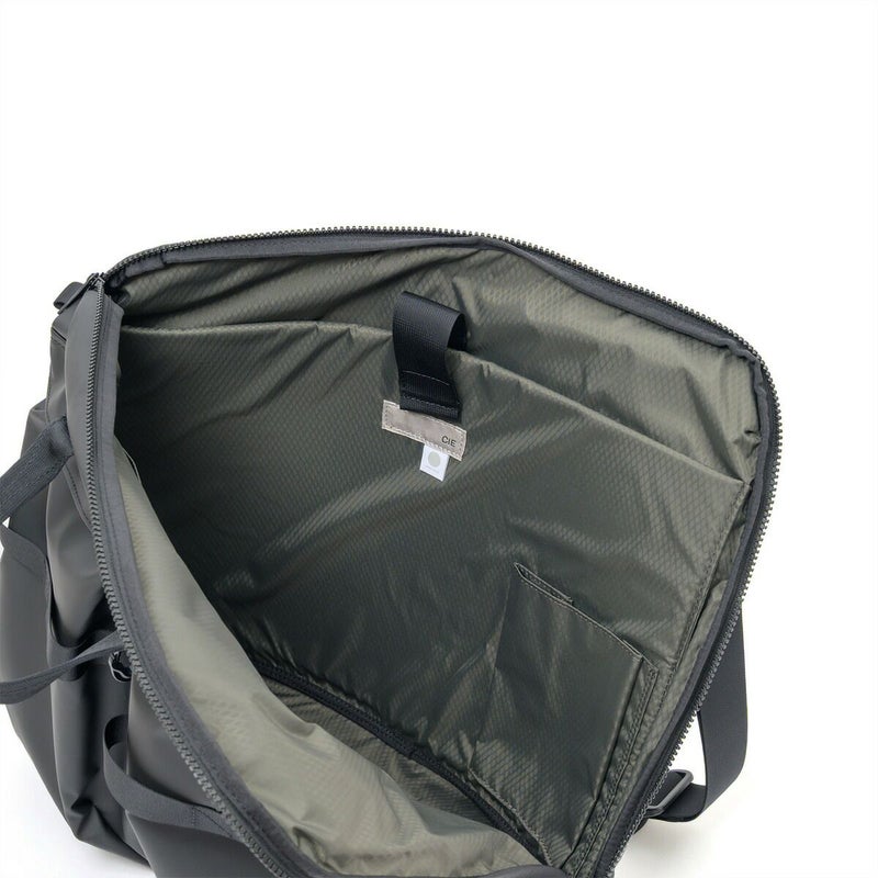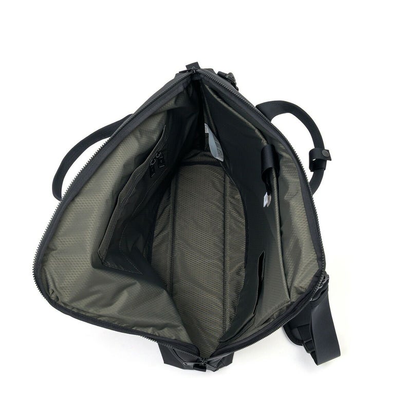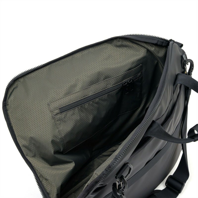 内装には収納層とZIPオープンポケット、ボトルを固定する筒状ポケットやPCポケットを配しています。また前面上部にはバッグを壁などに繋留させる為の名残であるスプリングフックは軽く利便性の高い樹脂フックを採用しています。