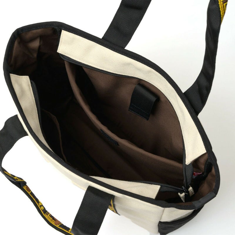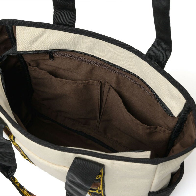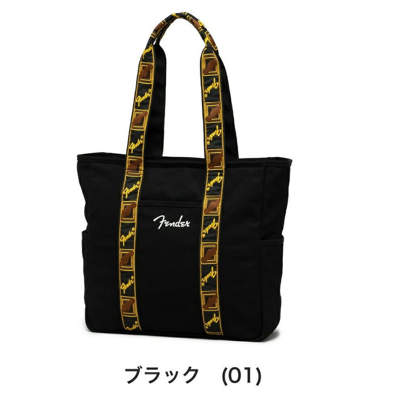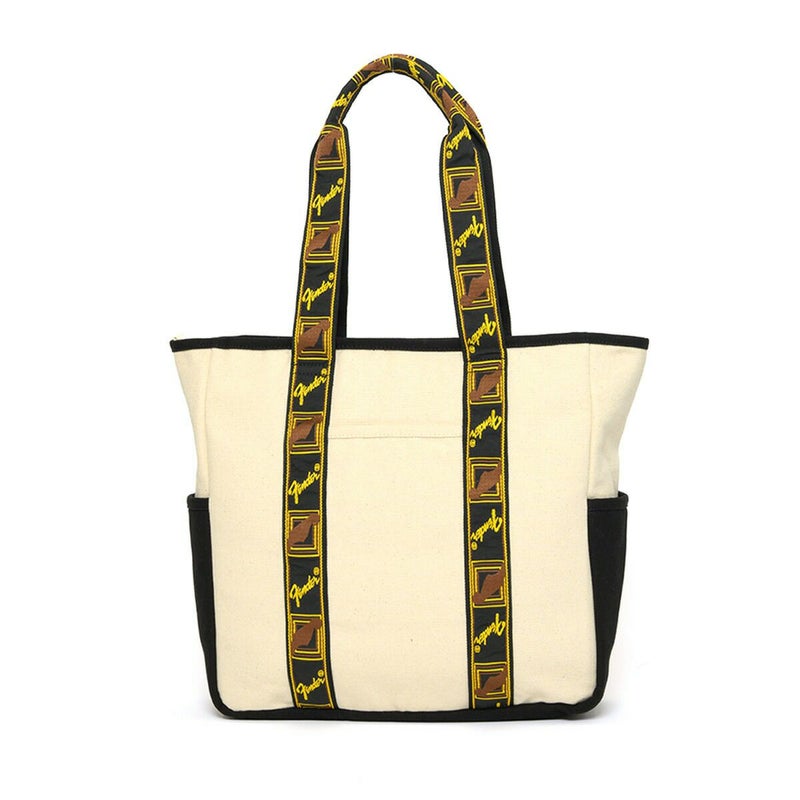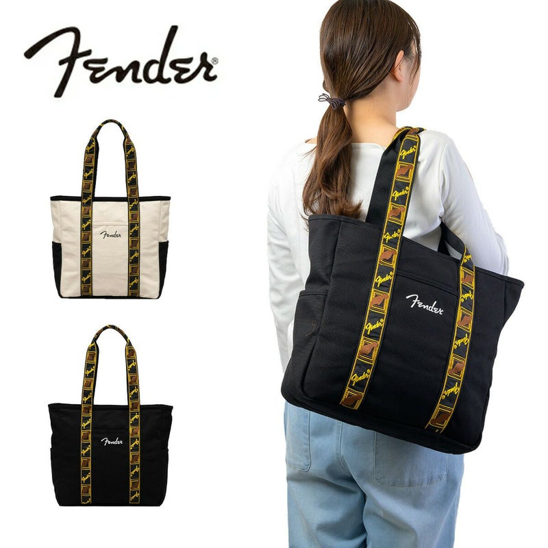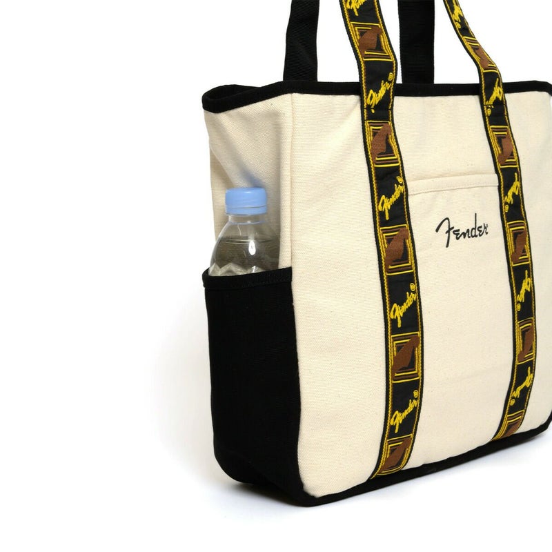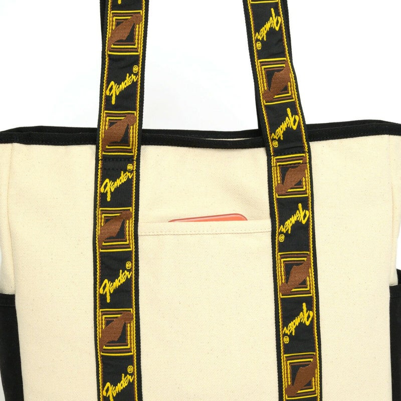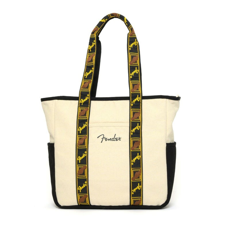 エレクトリックギターの代名詞ともいえるギターメーカー“FENDER(フェンダー)”のキャンバストートバッグ。 フェンダーのモノグラムストラップを忠実に再現した、ヴィンテージテイストなデザインのハンドルが目を惹くアイテム。 メイン収納スペースはA4サイズがすっぽり収まるデイリーユースに使いやすいサイズ感。広マチでお弁当箱など幅のある荷物も収納でき、ノートPCやタブレットが収納できるクッションポケットも完備しているので、通勤・通学にもご使用頂けます。 タウンユースにはもちろん、アウトドアや旅行、ピクニックやレジャーなど、幅広いシーンで活躍してくれます。程良くシンプルなので、フェンダーファンのみならず、多くの方に使いやすいトートバッグです。