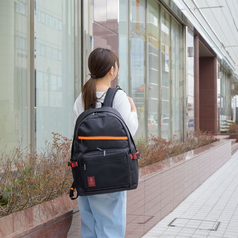 デイパックと呼ばれるトップラウンド型のリュックで、14インチのPCが入るスリーブや小物収納ポケットも内外に付属しています。